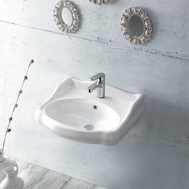 Traditional 24 inch wide wall mounted bathroom sink. Available in one or three faucet hole options, this sink is perfect for modern bathrooms. Sink is made of ceramic and includes an overflow. Made and designed by high-end and well known Turkish brand CeraStyle.