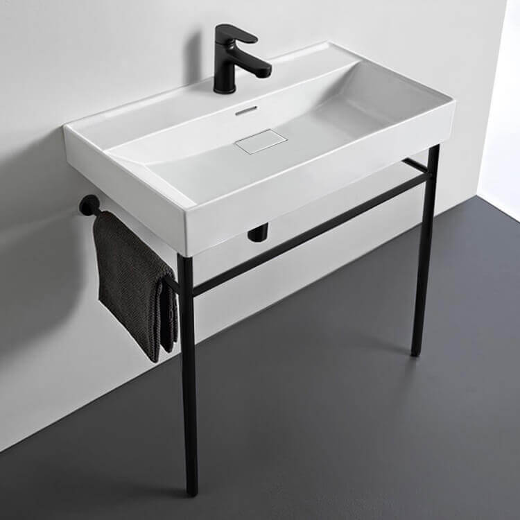 This uniquely stylish white ceramic console sink comes with a beautiful stand made of high-quality brass in a matte black finish to give a distinctive feel to any bathroom. Available in one or three hole options, this two piece sink is the perfect addition for your modern bathroom. Ceramic sink (Cerastyle 037300-U) is US and Canada standards approved (IAPMO, UPC/cUPC, ASME A112.19.2-2018/CSA B45.1-18).