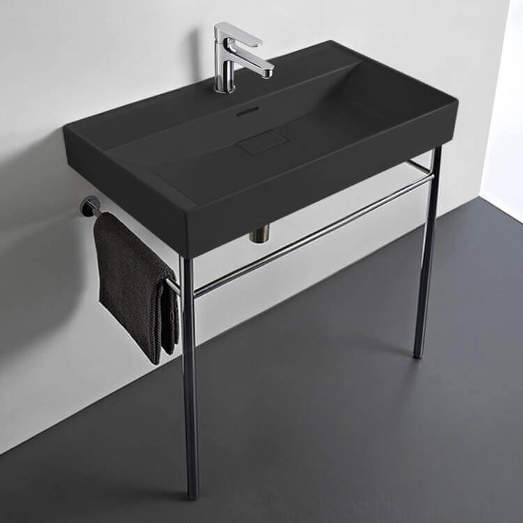 This uniquely stylish matte black ceramic console sink comes with a beautiful stand made of high-quality brass in a polished chrome finish to give a distinctive feel to any bathroom. Available in one or three hole options, this two piece sink is the perfect addition for your modern bathroom. Ceramic sink (Cerastyle 037307-U-97) is US and Canada standards approved (IAPMO, UPC/cUPC, ASME A112.19.2-2018/CSA B45.1-18).
