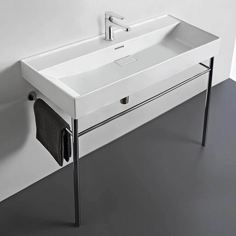 This uniquely stylish white ceramic console sink comes with a beautiful stand made of high-quality brass in a polished chrome finish to give a distinctive feel to any bathroom. Available in one or three hole options, this two piece sink is the perfect addition for your modern bathroom. Ceramic sink (Cerastyle 037500-U) is US and Canada standards approved (IAPMO, UPC/cUPC, ASME A112.19.2-2018/CSA B45.1-18).