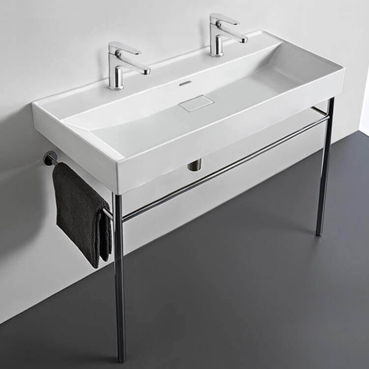 This uniquely stylish white ceramic console sink comes with a beautiful stand made of high-quality brass in a polished chrome finish to give a distinctive feel to any bathroom. Available in two hole option, this two piece trough sink is the perfect addition for your modern bathroom. Ceramic sink (Cerastyle 037600-U) is US and Canada standards approved (IAPMO, UPC/cUPC, ASME A112.19.2-2018/CSA B45.1-18).