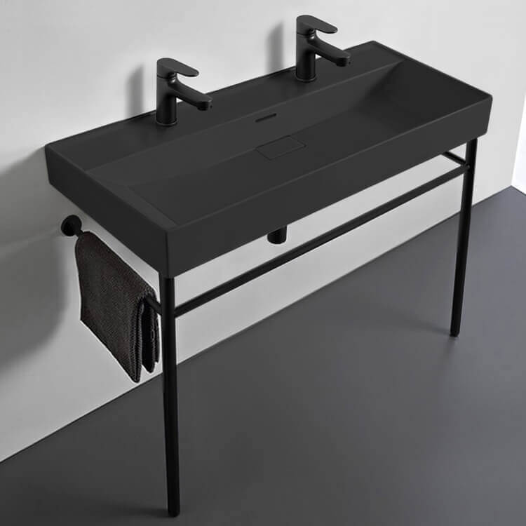 This uniquely stylish matte black ceramic console sink comes with a beautiful stand made of high-quality brass in a matte black finish to give a distinctive feel to any bathroom. Available in two hole option, this two piece trough sink is the perfect addition for your modern bathroom. Ceramic sink (Cerastyle 037607-U-97) is US and Canada standards approved (IAPMO, UPC/cUPC, ASME A112.19.2-2018/CSA B45.1-18).