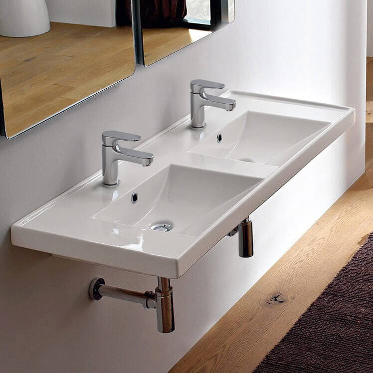 This white ceramic double sink offers enough counter space to keep everyone happy, and comes in either a self rimming model or as a wall mounted sink. With 48" inches of length, there's no lack of surface area with this model and you'll never struggle to find a spot for your soap, toothbrush holder, or any other bathroom need. With it's contemporary design, double overflows, and a variety of faucet hole options, this is the perfect sink for any large bathroom.