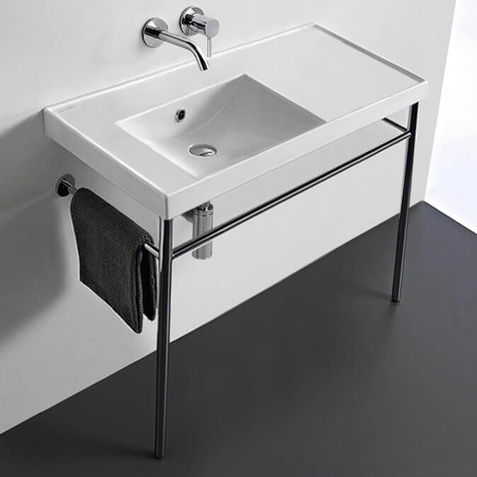 Perfect for the modern or contemporary bathroom atmosphere, this 36 inch bathroom console is made from built-to-last white ceramic. It comes in the no hole option. It comes complete with polished chrome legs made from brass. It was made in Italy by Scarabeo as part of their ML collection. Ceramic sink (Scarabeo 3008) is US and Canada standards approved (IAPMO, UPC/cUPC, ASME A112.19.2-2018/CSA B45.1-18).