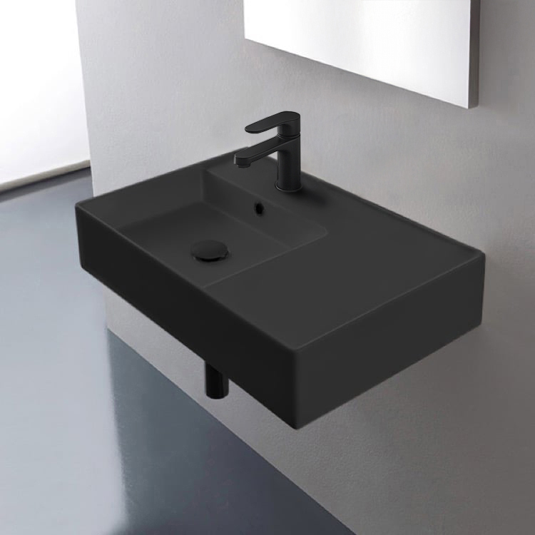 From the Italian designer Scarabeo, this matte black ceramic sink is part of the Teorema 2.0 collection. The sink comes in a no hole, one hole, or three hole option and equipped with plenty of counter space. It is functional as a wall mounted or vessel application and is perfect for the modern bathroom design.