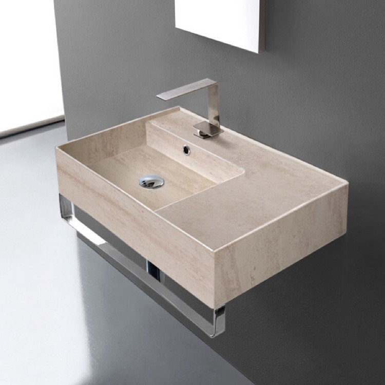 From the Italian designer Scarabeo, this beige travertine design ceramic sink is part of the Teorema 2.0 collection. The sink comes in a one hole or three hole option and equipped with plenty of counter space and towel bar. It is functional as a wall mounted application and is perfect for the modern bathroom design. Ceramic sink (Scarabeo 5114) is US and Canada standards approved (IAPMO, UPC/cUPC, ASME A112.19.2-2018/CSA B45.1-18).