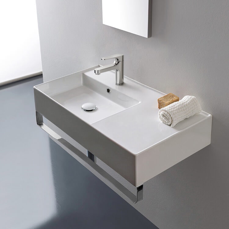 Perfect for the modern or contemporary bathroom atmosphere, this 32 inch bathroom sink is made from built-to-last white ceramic. It comes in the no hole, one hole, or three hole options and comes in wall mounted installation. Includes towel bar. It was made in Italy by Scarabeo as part of their Teorema 2.0 collection. Ceramic sink (Scarabeo 5115) is US and Canada standards approved (IAPMO, UPC/cUPC, ASME A112.19.2-2018/CSA B45.1-18).