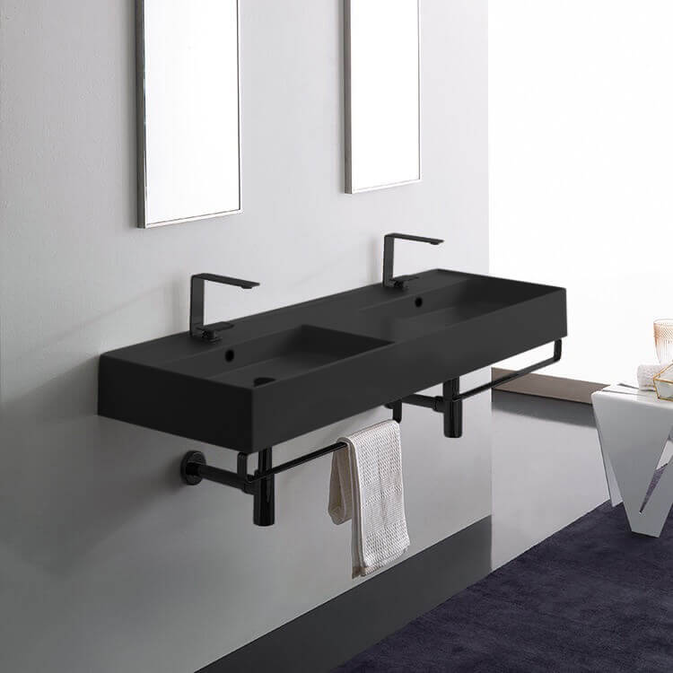 Designed in Italy by European designer Scarabeo, this wide double bathroom sink is perfect for the modern style master bathroom. It is a wall mounted bathroom sink that comes equipped with two matte black towel holder that mount to the underside of the sink for convenient towel usage. The sink is made from high quality matte black ceramic and is available in the two hole or six hole configurations. Ceramic sink (Scarabeo 5116-49) is US and Canada standards approved (IAPMO, UPC/cUPC, ASME A112.19.2-2018/CSA B45.1-18).