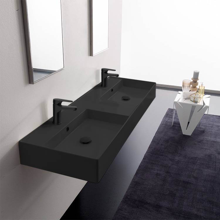 This double ceramic bathroom sink is made from high-quality ceramic in a matte black finish by Italian designer Scarabeo. It is a capable of being mounted to the wall or used in a vessel application and has a two hole or six hole configuration. This sink is part of the Scarabeo Teorema 2.0 collection.