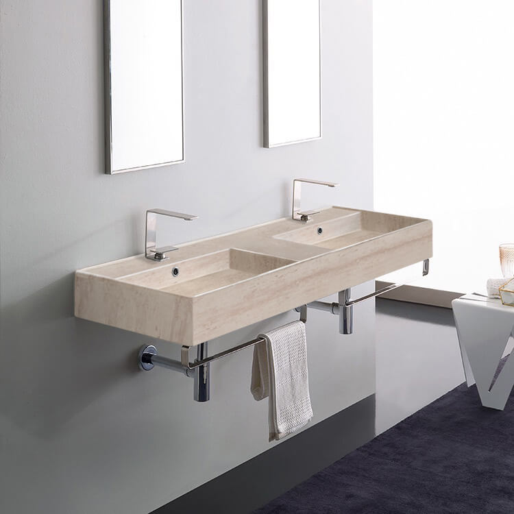 Designed in Italy by European designer Scarabeo, this wide double bathroom sink is perfect for the modern style master bathroom. It is a wall mounted bathroom sink that comes equipped with two chrome towel holder that mount to the underside of the sink for convenient towel usage. The sink is made from high quality beige travertine design ceramic and is available in the two hole or six hole configurations. Ceramic sink (Scarabeo 5116) is US and Canada standards approved (IAPMO, UPC/cUPC, ASME A112.19.2-2018/CSA B45.1-18).