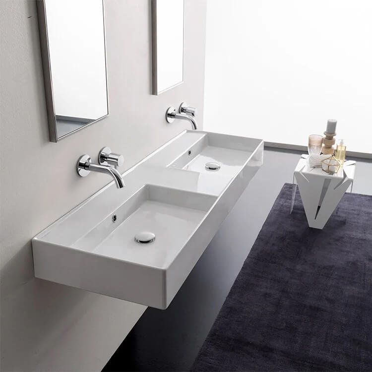 This double ceramic bathroom sink is made from high quality white ceramic by Italian designer Scarabeo. It is a capable of being mounted to the wall or used in a vessel application and has a no hole configuration. This sink is part if Scarabeo's Teorema 2.0 collection.