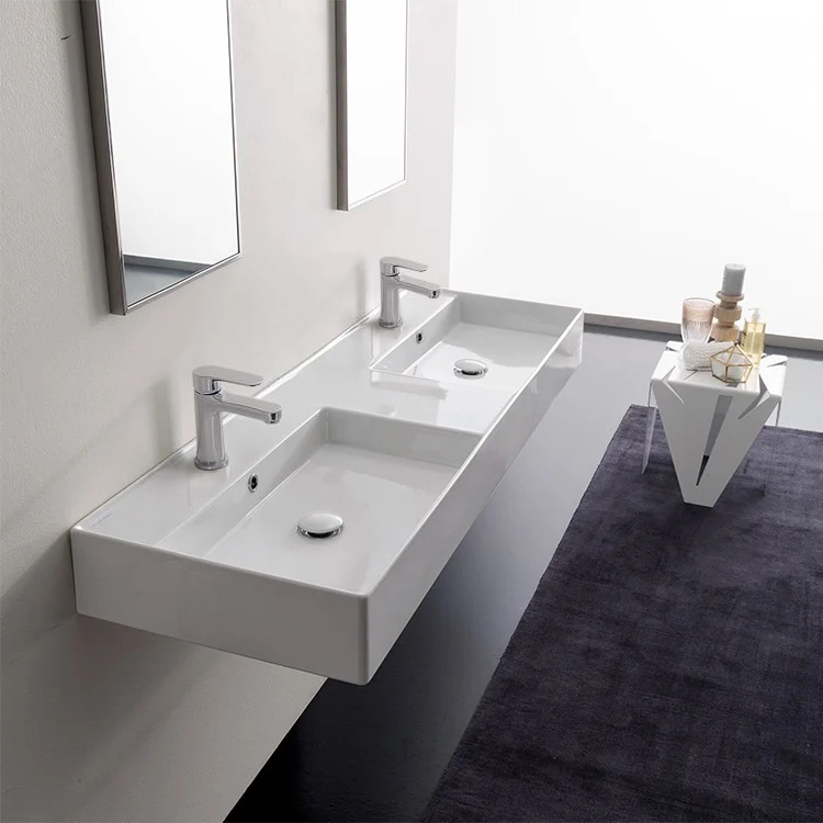 This double ceramic bathroom sink is made from high quality white ceramic by Italian designer Scarabeo. It is a capable of being mounted to the wall or used in a vessel application and available in a two hole, no hole, or six hole configuration. This sink is part if Scarabeo's Teorema 2.0 collection.