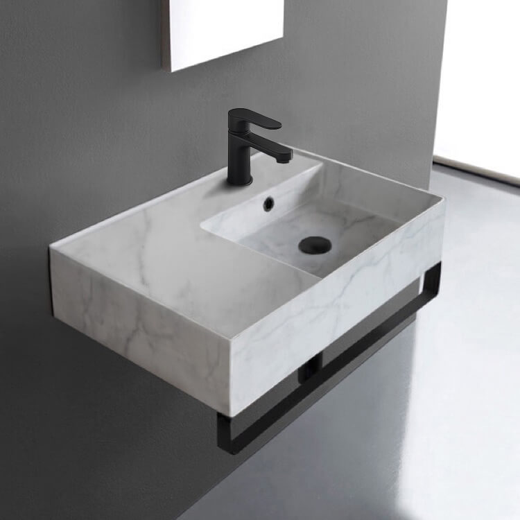 Marble Design Ceramic Wall Mounted Sink With Black Towel Bar