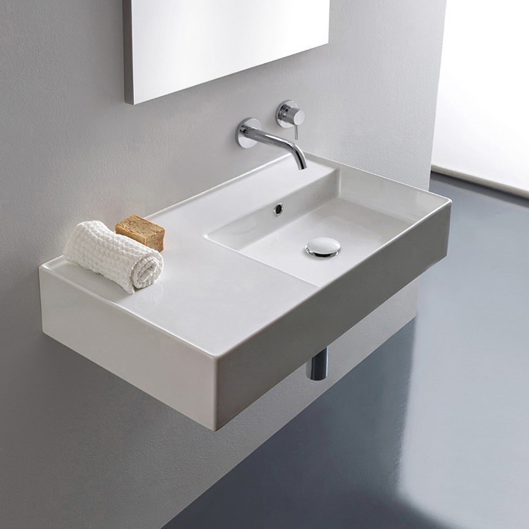Perfect for the modern or contemporary bathroom atmosphere, this 32 inch bathroom sink is made from built-to-last white ceramic. It comes in the no hole option and can be either wall mounted or vessel installation. It was made in Italy by Scarabeo as part of their Teorema 2.0 collection,