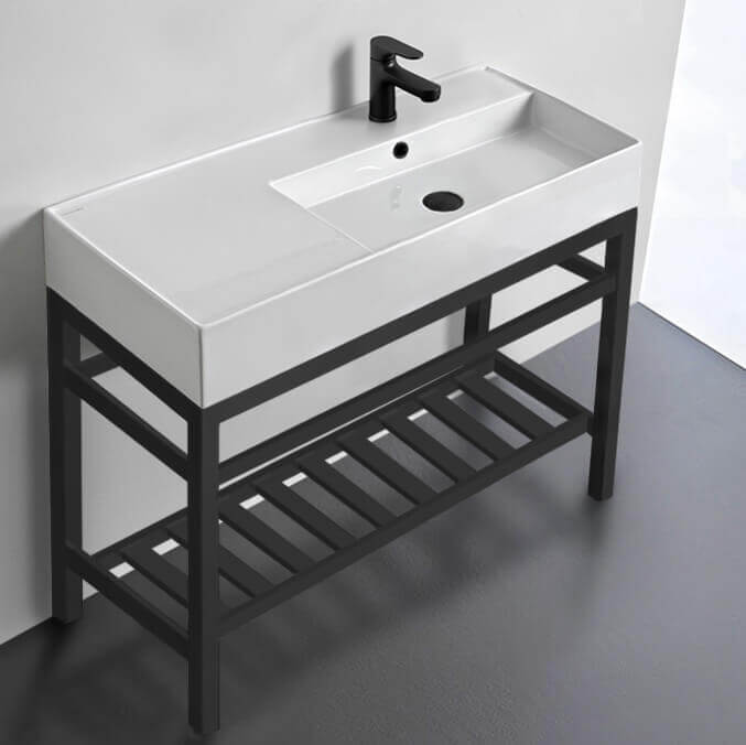 This console bathroom sink is a perfect center piece for the modern style bathroom. Featuring a lower towel rack, this console stand is a perfect solution to keep your towels and other accessories tidy. Console stand is made of heavy duty stainless steel in a matte black finish. Beautiful 39.8" x 18.1" white ceramic sink with counter space on left side of the basin. Ceramic sink (Scarabeo 5120) is US and Canada standards approved (IAPMO, UPC/cUPC, ASME A112.19.2-2018/CSA B45.1-18).