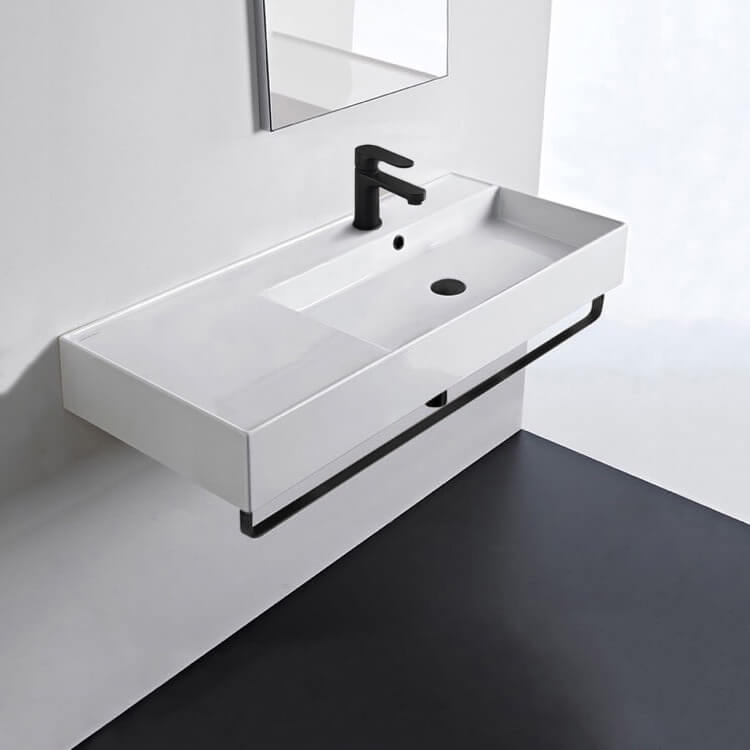 Rectangular Ceramic Wall Mounted Sink, Black Towel Bar Included