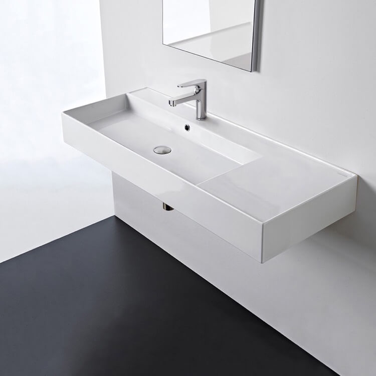 Perfect for the modern or contemporary bathroom atmosphere, this 48 inch bathroom sink is made from built-to-last white ceramic. It comes in the no hole, one hole, or three hole options and can be either wall mounted or vessel installation. It was made in Italy by Scarabeo as part of their Teorema 2.0 collection.