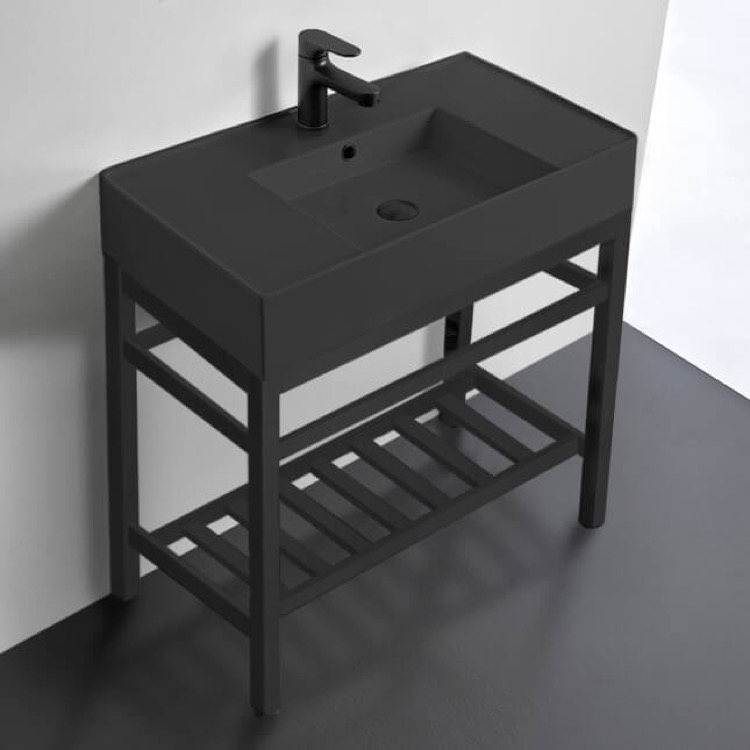 This matte black console bathroom sink is a perfect center piece for the modern style bathroom. Featuring a lower towel rack, this console stand is a perfect solution to keep your towels and other accessories tidy. Console stand is made of heavy duty stainless steel in a matte black finish. Beautiful 31.9" x 17.4" matte black ceramic sink with counter space on both side of the basin. Ceramic sink (Scarabeo 5123-49) is US and Canada standards approved (IAPMO, UPC/cUPC, ASME A112.19.2-2018/CSA B45.1-18).