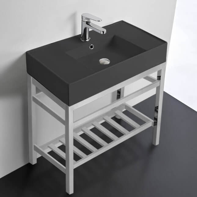 This matte black console bathroom sink is a perfect center piece for the modern style bathroom. Featuring a lower towel rack, this console stand is a perfect solution to keep your towels and other accessories tidy. Console stand is made of heavy duty stainless steel in a polished chrome finish. Beautiful 31.9" x 17.4" white ceramic sink with counter space on both side of the basin. Ceramic sink (Scarabeo 5123-49) is US and Canada standards approved (IAPMO, UPC/cUPC, ASME A112.19.2-2018/CSA B45.1-18).