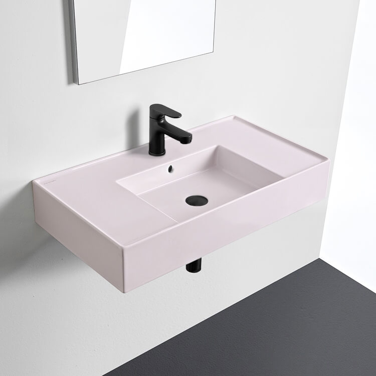 Perfect for the modern or contemporary bathroom atmosphere, this 32 inch bathroom sink is made from built-to-last light pink ceramic. It comes in the one hole or three hole options and can be either wall mounted or vessel installation. It was made in Italy by Scarabeo as part of their Teorema 2.0 collection.