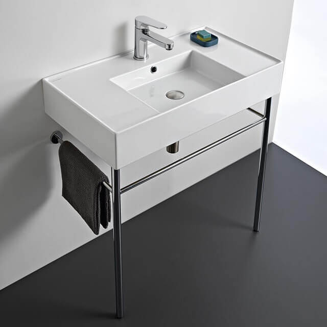 This 32 inch console set was designed by Italian manufacturer Scarabeo. Inspired by the modern or contemporary style bathroom, this console comes with a white ceramic sink and chrome console mount. This console is available in one hole, three hole, or no hole settings. It is part of the Teorema 2.0 collection. Ceramic sink (Scarabeo 5123) is US and Canada standards approved (IAPMO, UPC/cUPC, ASME A112.19.2-2018/CSA B45.1-18).