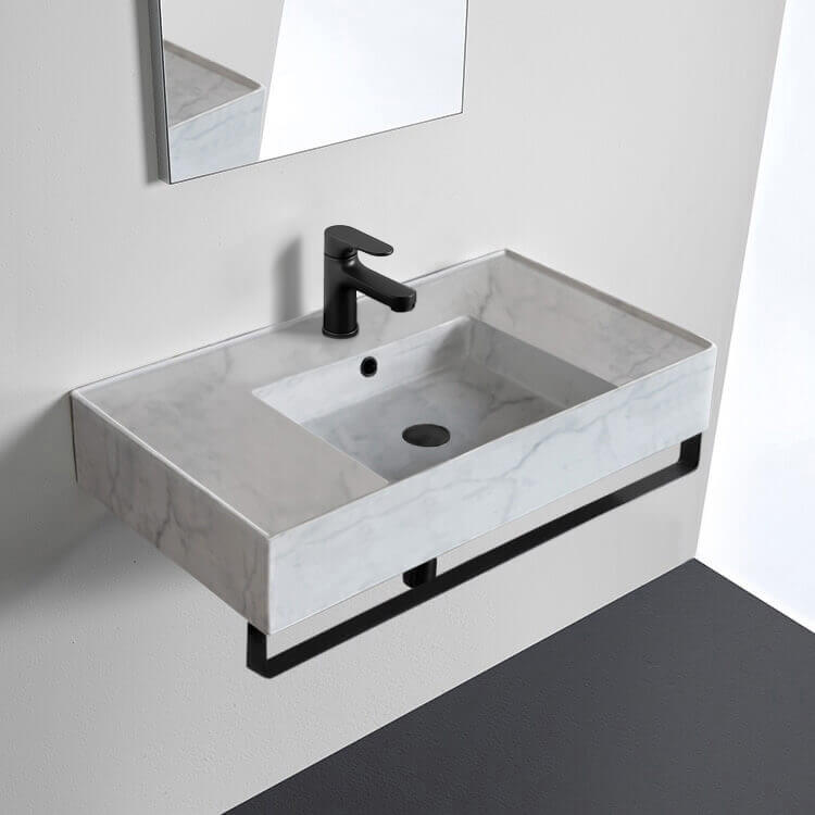 Marble Design Ceramic Wall Mounted Sink With Black Towel Bar