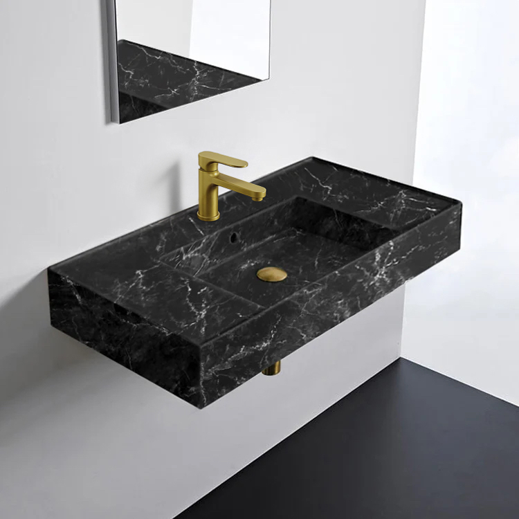 Black Marble Design Ceramic Wall Mounted or Vessel Sink With Counter Space