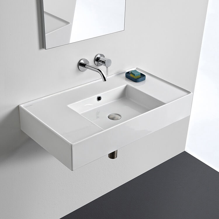 Perfect for the modern or contemporary bathroom atmosphere, this 32 inch bathroom sink is made from built-to-last white ceramic. It comes in the no hole option and can be either wall mounted or vessel installation. It was made in Italy by Scarabeo as part of their Teorema 2.0 collection.