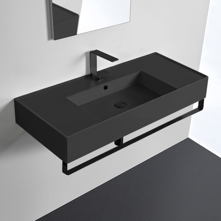 Perfect for the modern or contemporary bathroom atmosphere, this 40 inch bathroom sink is made from built-to-last matte black ceramic. It comes in the one hole, three hole, or no hole options and comes in wall mounted installation. Includes matte black towel bar. It was made in Italy by Scarabeo as part of their Teorema 2.0 collection. Ceramic sink (Scarabeo 5124-49) is US and Canada standards approved (IAPMO, UPC/cUPC, ASME A112.19.2-2018/CSA B45.1-18).