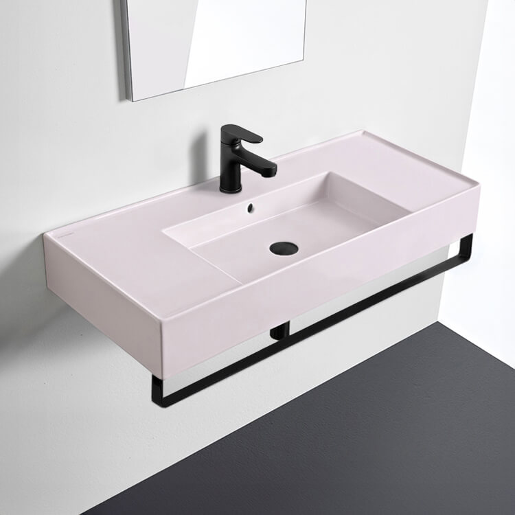 Perfect for the modern or contemporary bathroom atmosphere, this 40 inch bathroom sink is made from built-to-last light pink ceramic. It comes in the one hole or three hole options and comes in wall mounted installation. Includes matte black towel bar. It was made in Italy by Scarabeo as part of their Teorema 2.0 collection. Ceramic sink (Scarabeo 5124-49) is US and Canada standards approved (IAPMO, UPC/cUPC, ASME A112.19.2-2018/CSA B45.1-18).