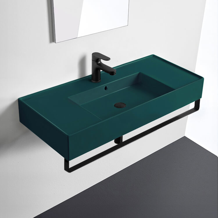 Perfect for the modern or contemporary bathroom atmosphere, this 40 inch bathroom sink is made from built-to-last jade green ceramic. It comes in the one hole or three hole options and comes in wall mounted installation. Includes matte black towel bar. It was made in Italy by Scarabeo as part of their Teorema 2.0 collection. Ceramic sink (Scarabeo 5124-49) is US and Canada standards approved (IAPMO, UPC/cUPC, ASME A112.19.2-2018/CSA B45.1-18).
