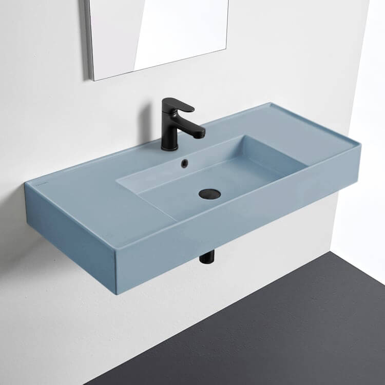 Perfect for the modern or contemporary bathroom atmosphere, this 40 inch bathroom sink is made from built-to-last light blue ceramic. It comes in the one hole or three hole options and can be either wall mounted or vessel installation. It was made in Italy by Scarabeo as part of their Teorema 2.0 collection.
