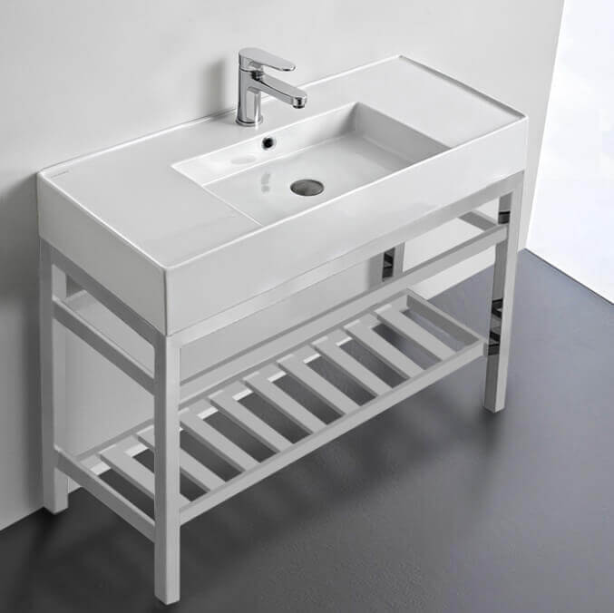 This console bathroom sink is a perfect center piece for the modern style bathroom. Featuring a lower towel rack, this console stand is a perfect solution to keep your towels and other accessories tidy. Console stand is made of heavy duty stainless steel in a polished chrome finish. Beautiful 40" x 18.2" white ceramic sink with counter space on both side of the basin. Ceramic sink (Scarabeo 5124) is US and Canada standards approved (IAPMO, UPC/cUPC, ASME A112.19.2-2018/CSA B45.1-18).