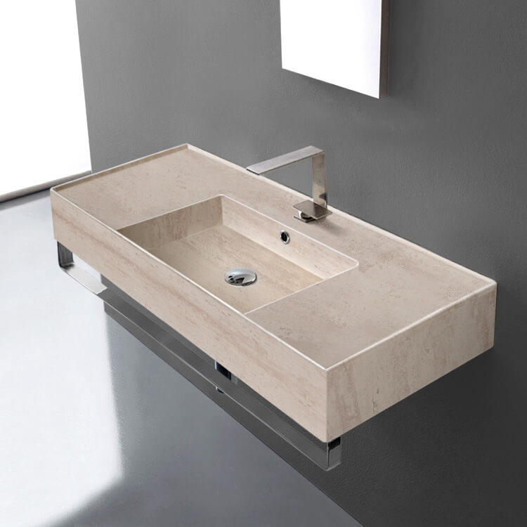 Perfect for the modern or contemporary bathroom atmosphere, this 40 inch bathroom sink is made from built-to-last beige travertine design ceramic. It comes in the one hole or three hole options and comes in wall mounted installation. Includes towel bar. It was made in Italy by Scarabeo as part of their Teorema 2.0 collection. Ceramic sink (Scarabeo 5124) is US and Canada standards approved (IAPMO, UPC/cUPC, ASME A112.19.2-2018/CSA B45.1-18).