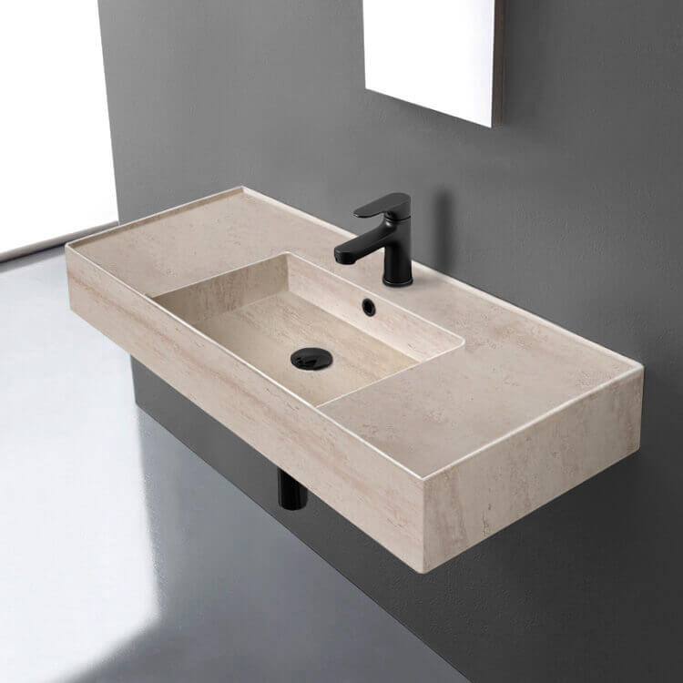 Perfect for the modern or contemporary bathroom atmosphere, this 40 inch bathroom sink is made from built-to-last beige travertine design ceramic. It comes in the one hole or three hole options and can be either wall mounted or vessel installation. It was made in Italy by Scarabeo as part of their Teorema 2.0 collection.