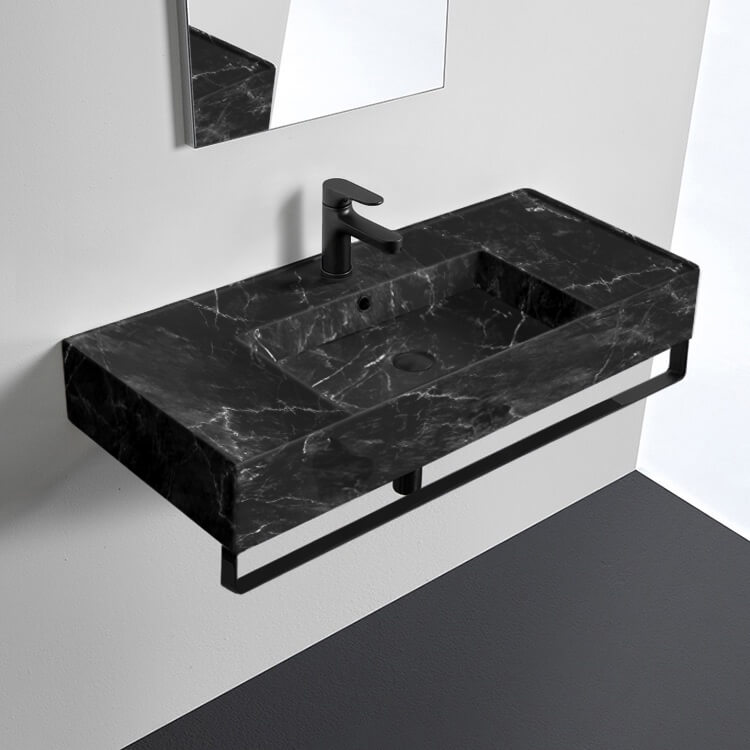 Black Marble Design Ceramic Wall Mounted Sink With Black Marble Design Towel Bar