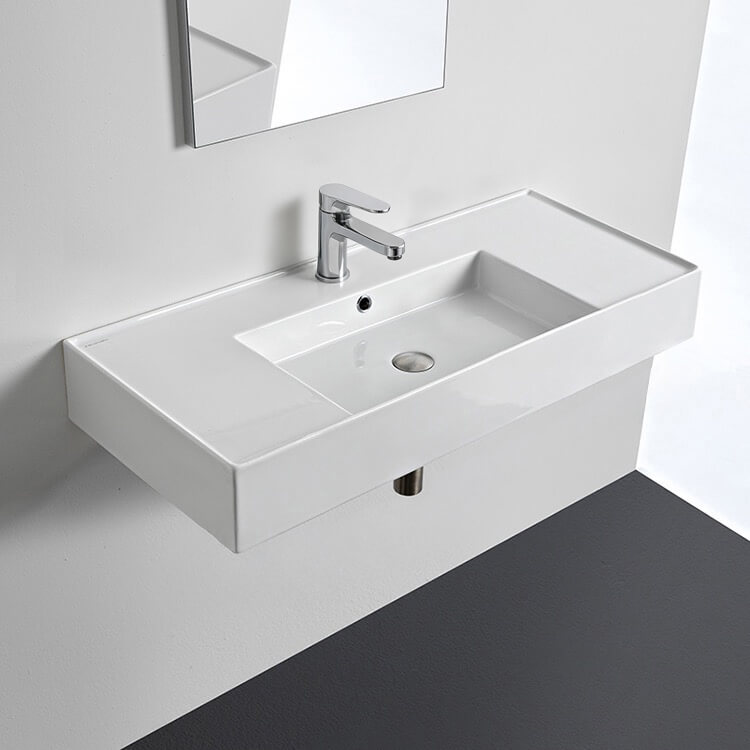 Perfect for the modern or contemporary bathroom atmosphere, this 40 inch bathroom sink is made from built-to-last white ceramic. It comes in the one hole, three hole or no hole options and can be either wall mounted or vessel installation. It was made in Italy by Scarabeo as part of their Teorema 2.0 collection.