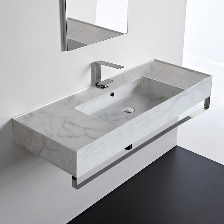 Wall Mounted Marble Design Ceramic Sink With Polished Chrome Towel Bar