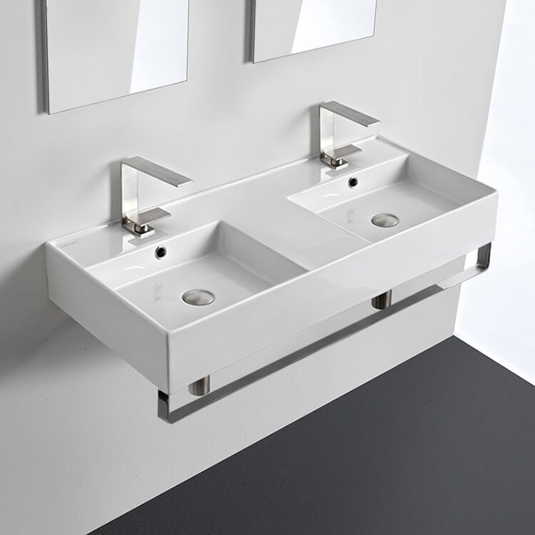 Designed and made in Italy by Scarabeo, this double ceramic bathroom sink is perfect for the modern style master bathroom. This elegant wall mounted bathroom sink comes equipped a chrome towel holder that mount to the underside of the sink for convenient towel usage. Sink has a dimensions of 40" x 18" and features a modern design with extra counter space. The sink is made from high quality ceramic and is available in a two hole configuration.