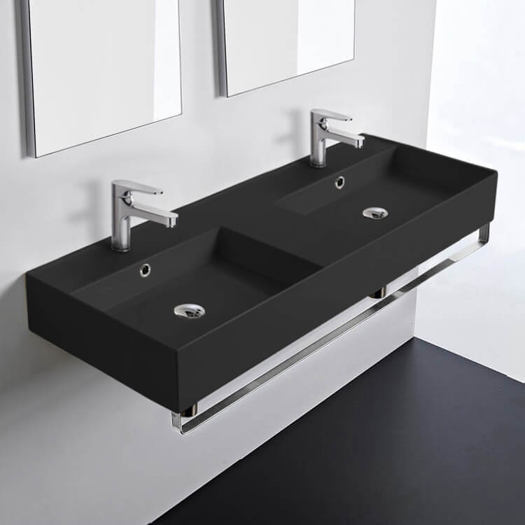 Designed and made in Italy by Scarabeo, this double matte black ceramic bathroom sink is perfect for the modern style master bathroom. This elegant wall mounted bathroom sink comes equipped a chrome towel holder that mount to the underside of the sink for convenient towel usage. Sink has a dimensions of 48" x 18" and features a modern design with extra counter space. The sink is made from high quality matte black ceramic and is available in a two hole or six hole configuration. Ceramic sink (Scarabeo 5143-49) is US and Canada standards approved (IAPMO, UPC/cUPC, ASME A112.19.2-2018/CSA B45.1-18).