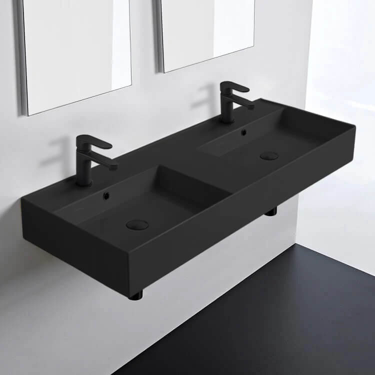 This double ceramic bathroom sink is made from high quality matte black ceramic by Italian designer Scarabeo. Sink has a dimension of 48" x 18" and is capable of being mounted to the wall or used in a vessel application. This sink is available with two or six pre-drilled hole configuarations. This sink is part if Scarabeo's Teorema 2.0 collection.