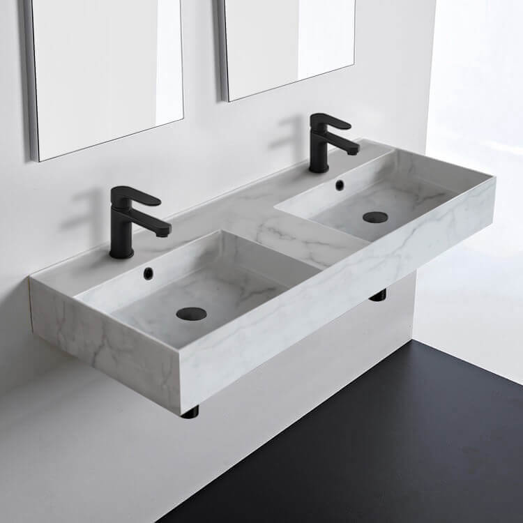 Marble Design Ceramic Wall Mounted or Vessel Double Sink With Counter Space