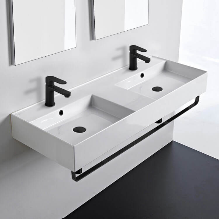 Designed and made in Italy by Scarabeo, this double ceramic bathroom sink is perfect for the modern style master bathroom. This elegant wall mounted bathroom sink comes equipped a matte black towel holder that mount to the underside of the sink for convenient towel usage. Sink has a dimensions of 48" x 18" and features a modern design with extra counter space. The sink is made from high quality ceramic and is available in a two hole or six hole configuration. Ceramic sink (Scarabeo 5143) is US and Canada standards approved (IAPMO, UPC/cUPC, ASME A112.19.2-2018/CSA B45.1-18).