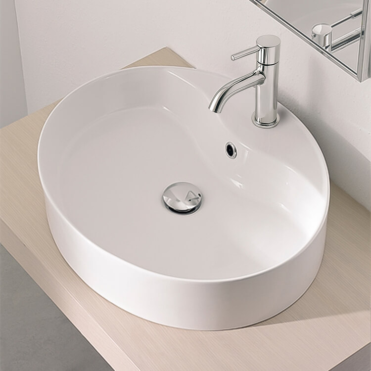 Contemporary design in an oval shaped, vessel bathroom sink. With a single faucet hole and included overflow, this white ceramic sink fits instantly into your modern styled bathroom with easy to install packaging.