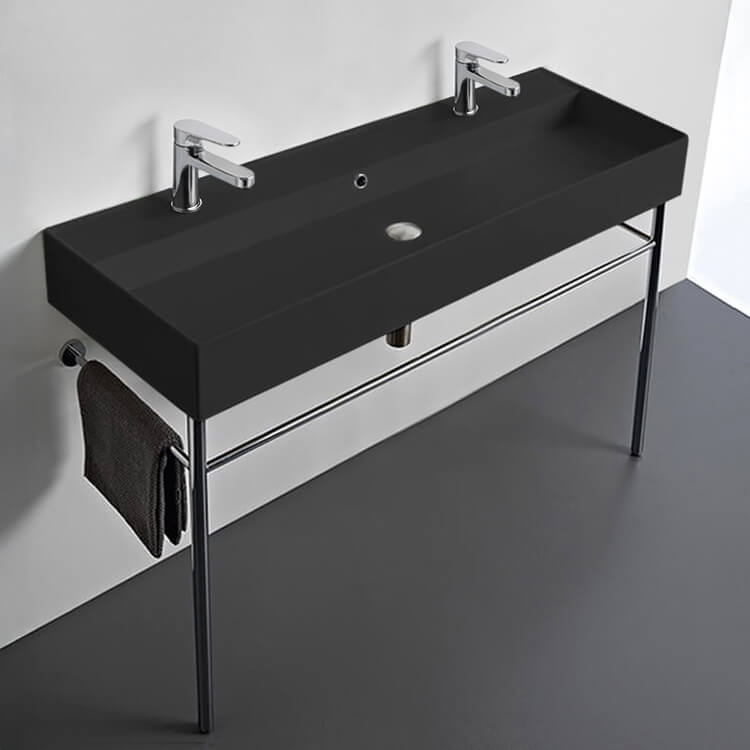 A modern style makes this matte black ceramic console bathroom sink the perfect fit for your modernized bathroom. With two hole or six faucet holes, this trough style double sink includes a beautiful polished chrome stand made out of high-quality brass. Ceramic sink (Scarabeo 8031/R-120B-49) is US and Canada standards approved (IAPMO, UPC/cUPC, ASME A112.19.2-2018/CSA B45.1-18).
