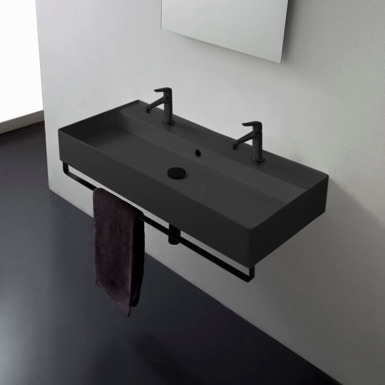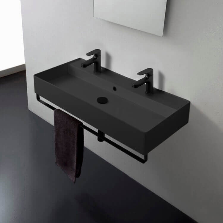 Double Black Wall Mounted Ceramic Sink With Black Towel Bar