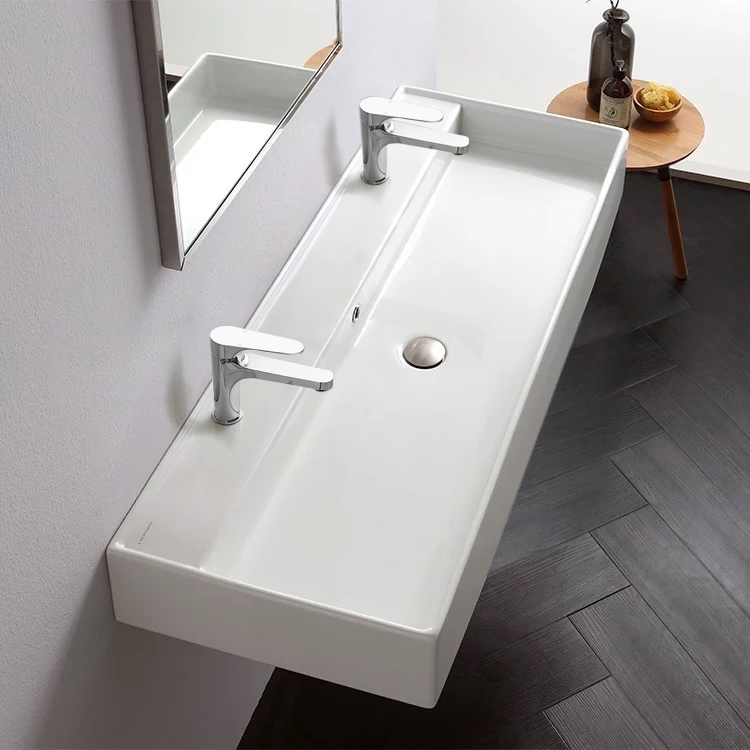 This rectangular ceramic sink can be used as a wall hung bath sink or as an above mount bath sink. Featuring a sleek double trough sink design with overflow and available in two or no hole styles.