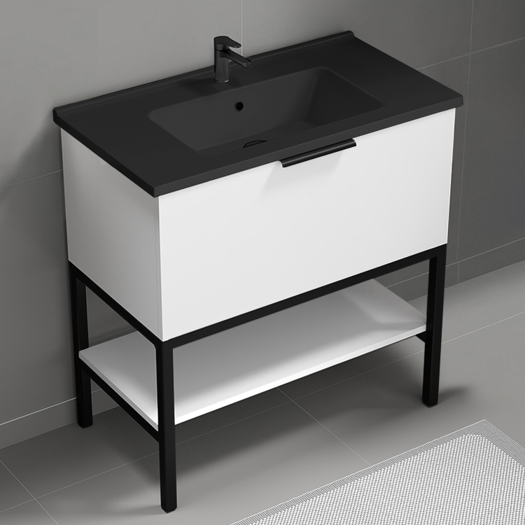 This modern floor standing bathroom vanity set was designed by high-end brand Nameek's. Inspired by contemporary and modern style bathroom design, this bathroom vanity set comes with a beautiful matte black sleek ceramic sink that perfectly fits into a vanity cabinet with one drawer on top of a matte black metal base with a shelf for additional storage space. Vanity cabinet is made of durable engineered wood available in four finishes and features one soft-closing drawer with black drawer handle. This vanity set is part of the Bodrum collection. Make a bold statement in your bathroom now with this modern bathroom vanity set.