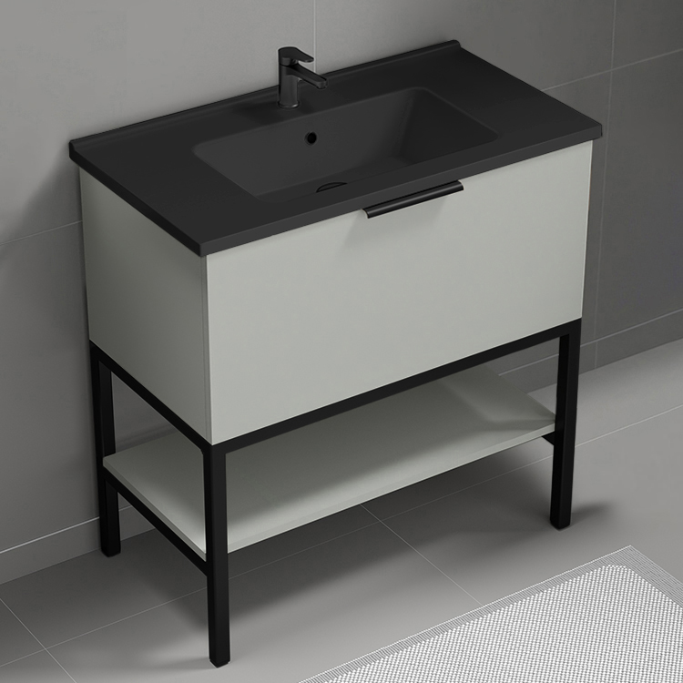 This modern floor standing bathroom vanity set was designed by high-end brand Nameek's. Inspired by contemporary and modern style bathroom design, this bathroom vanity set comes with a beautiful matte black sleek ceramic sink that perfectly fits into a vanity cabinet with one drawer on top of a matte black metal base with a shelf for additional storage space. Vanity cabinet is made of durable engineered wood available in four finishes and features one soft-closing drawer with black drawer handle. This vanity set is part of the Bodrum collection. Make a bold statement in your bathroom now with this modern bathroom vanity set.