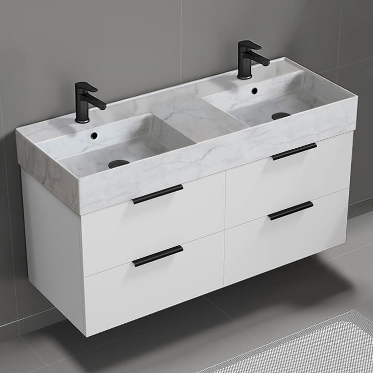 This ultra modern wall mounted double bathroom vanity set was designed by high-end brand Nameek's. Inspired by modern and contemporary style bathroom design, this bathroom vanity set comes with a beautiful white marble design ceramic double sink that perfectly fits into a vanity cabinet with four spacious drawers. Ceramic double sink features counter space in the center of the sink. Vanity cabinet is made of durable engineered wood and features four soft-closing drawers with sleek black drawer handles. This vanity set is part of the Derin collection. Make a bold statement in your bathroom now with this modern bathroom vanity set.